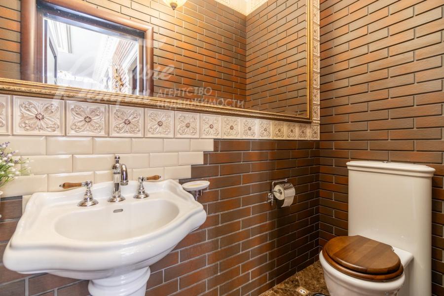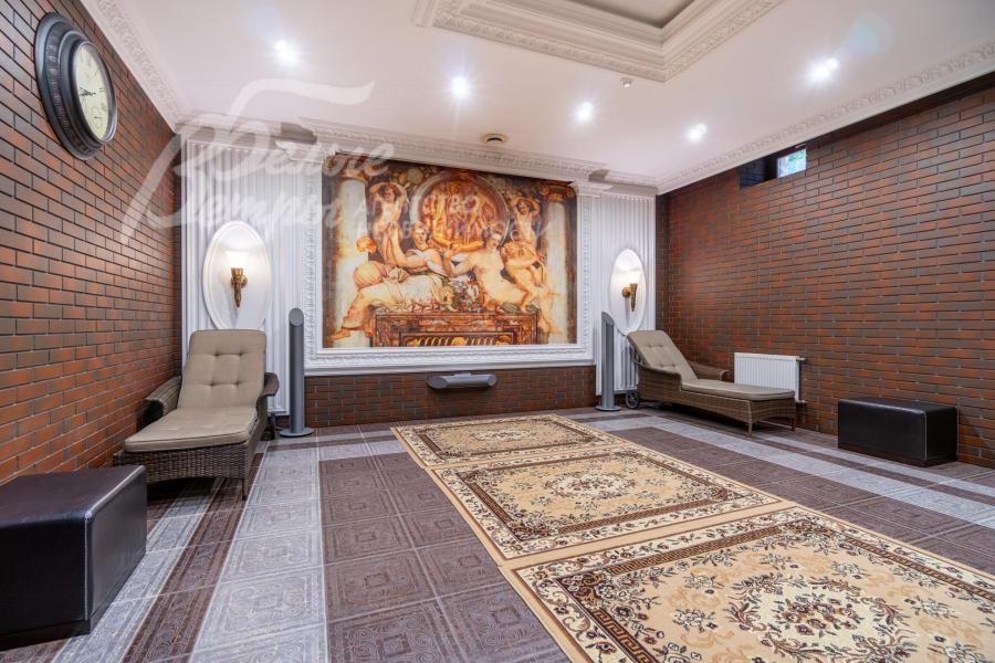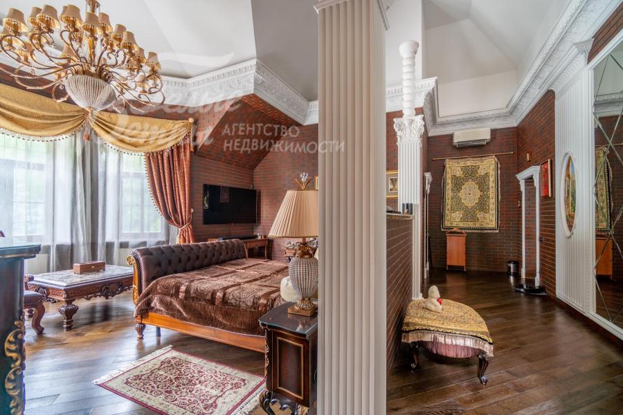 Описание внутренней отделки: роскошная отделка в классическом стиле выполнена по индивидуальному дизайн-проекту одного из пяти ведущих дизайнеров России с обширным применением натурального мрамора и декоративной гипсовой лепнины. В оформлении стен преобладает клинкерная плитка под кирпич (общая площадь плитки – 1500 кв.м) с декором из гипса по индивидуальным эскизам, выполненным на месте работ (узорчатые панно, карнизы, полуколонны и другие элементы). В спальнях (кроме мастер-спальни) – шелковые обои (Франция). В санузлах – плитка (в санузле при мастер-спальне – оникс). На полу в общих зонах – мрамор (Emperador Dark, общая площадь 400 кв.м) с водяным подогревом, в спальнях – доска из морёного дуба. Потолки – многоуровневые с широкими гипсовыми карнизами. Установлены межкомнатные двери из массива дуба, часть из них – со вставками из зеркал (производство Новый интерьер), дорогостоящая входная дверь, мраморные подоконники (Emperador Dark). Системы освещения, включающие розетки под люстры и точечные светильники, создают эстетичное обрамление для фресок на античные сюжеты. На второй этаж ведёт железобетонная лестница со ступенями, отделанными мрамором (Emperador White), перилами художественной ковки, поручнями из массива дуба, декоративная отделка нижней части лестничного марша выполнена с использованием гипсовых элементов, изготовленных по авторским эскизам на объекте. Гостиную украшает двухсторонний камин гильотинного типа, облицованный мрамором двух видов. В спа-зоне чаша бассейна отделана мозаикой, в парной – канадский кедр.