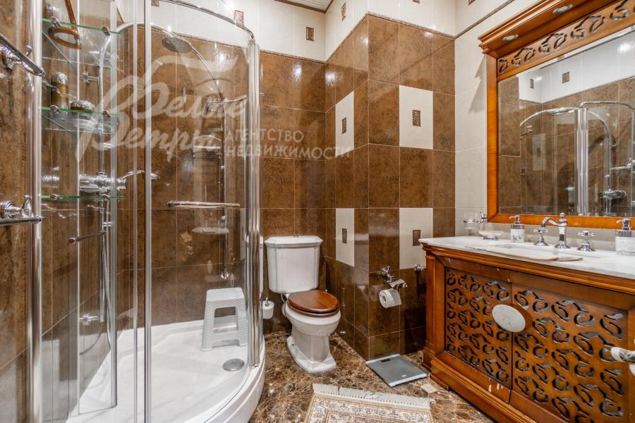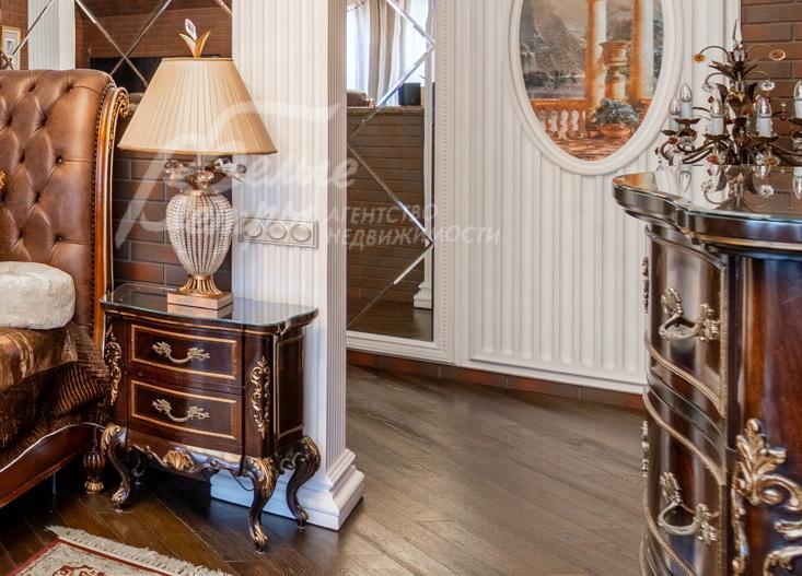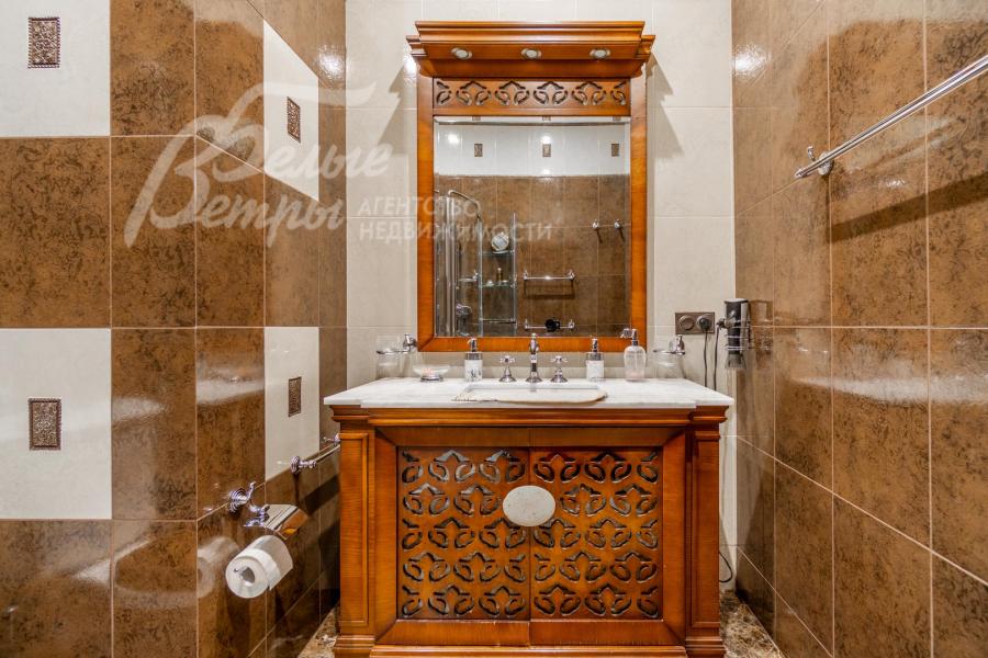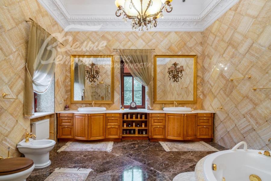 Мебель, оборудование: на кухне – гарнитур с фасадами из дерева, мраморной столешницей (производитель GIORGIO PIOTTO, Италия), встроенная техника: холодильники Kuppersbusch, газовая плита AEG (Electrolux), посудомоечная машина Electrolux, шкаф с техникой - Kuppersbusch (кофемашина, СВЧ-печь, пароварка, духовой и винный шкаф). В столовой – мебель из массива дерева с тканевыми вставками BRUNO ZAMPA, Италия. В гостиной и спальнях – диваны, кресла, кровати из массива дерева с тканевыми вставками CEPPI, Италия. В спальных гарнитурах – элементы из натуральной кожи CEPPI и PREGNO, Италия. Интерьер дополнен эксклюзивными итальянскими шкафами, столами, тумбами (PREGNO, GIORGIO PIOTTO, PREGNO, DANTI). В гостиной (второй свет) – большая хрустальная люстра с металлическими элементами (IF JENY), в других помещениях – люстры из металла, хрусталя, стекла, оникса (IF JENY). Помещения декорированы авторскими шторами российского производства (индивидуальный пошив) из микровелюра, тюля, жаккарда и гобелена. В санузлах - сантехника ведущих брендов: JACOB DELAFON, GLOBO, NICOLAZZI (Италия)